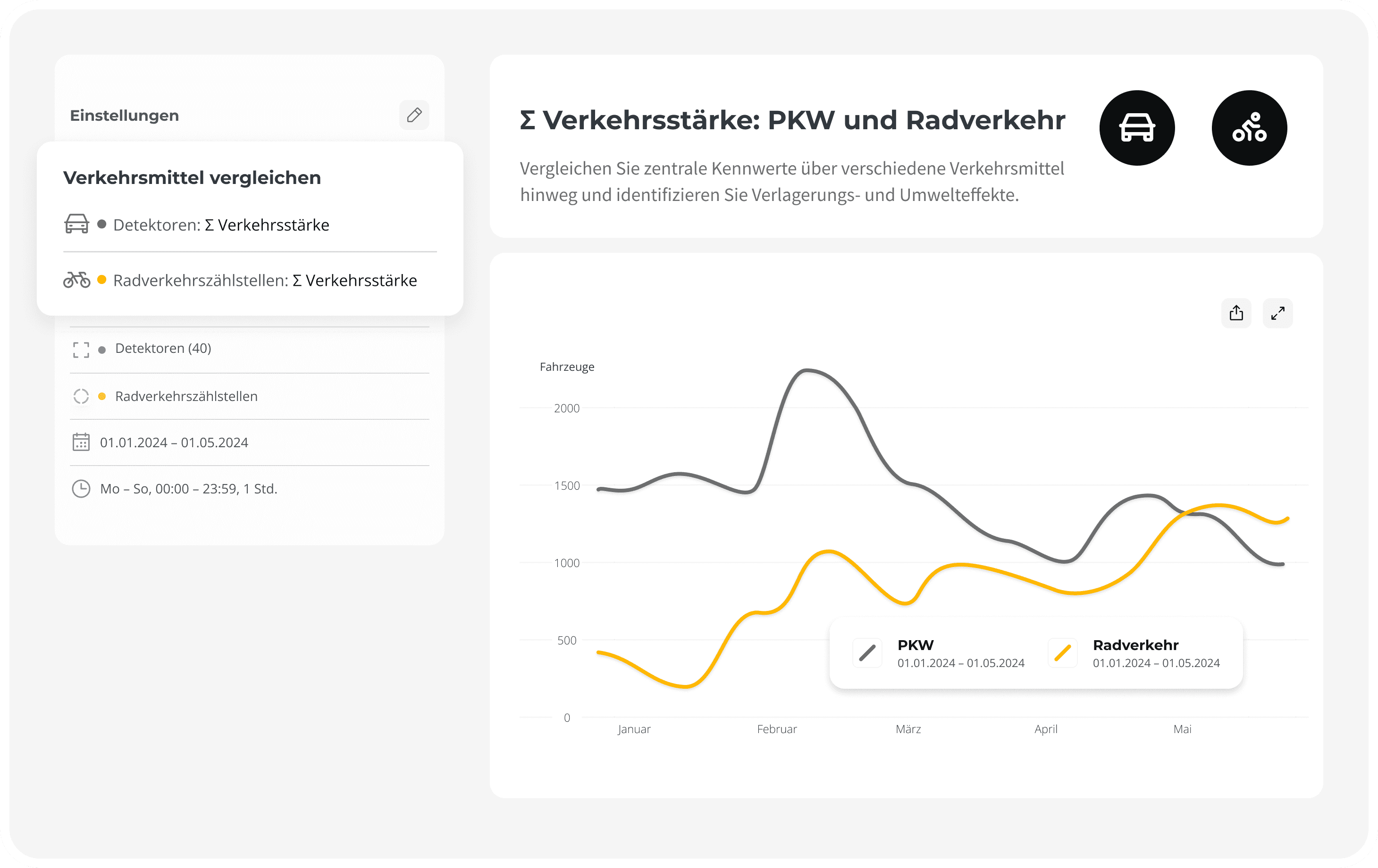 Alle Module im Überblick: Kombinieren Sie die passenden Bausteine für Ihre Anwendungsfälle, um Überlastungen zu erkennen, Maßnahmen zu bewerten und Mobilitätsentwicklungen gezielt zu beeinflussen.